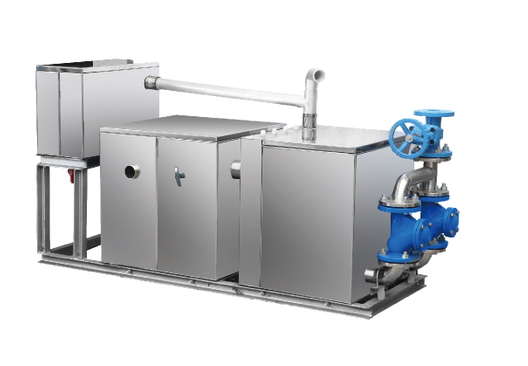 *当厨房油污废水流入除渣区时,污水中的固体悬浮杂物(如菜叶、米饭、碎骨头等杂物)被自动拦截至除渣滤篮中;